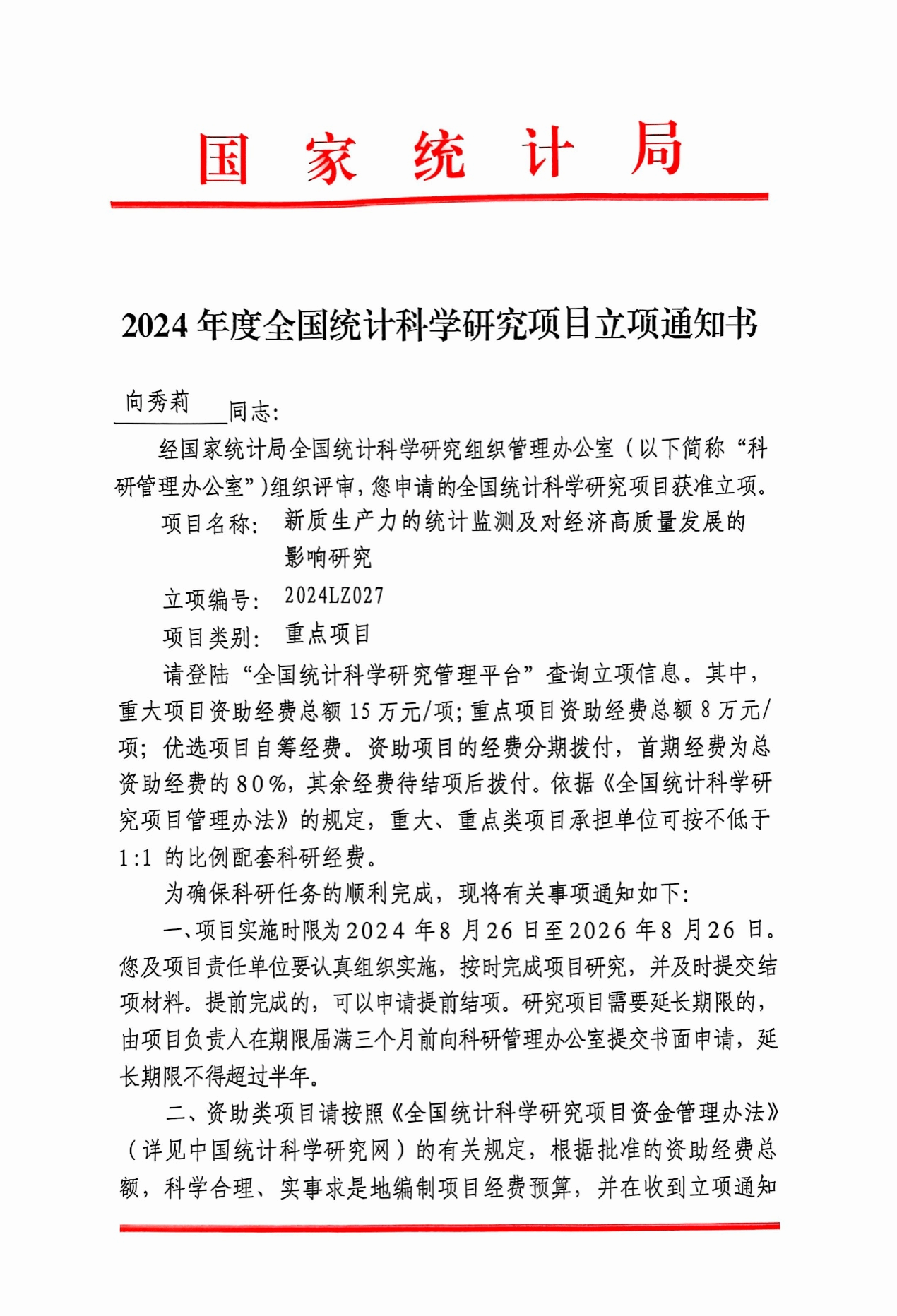8月26日,国家统计局公布了2024年度全国统计科学研究项目立项名单,威廉希尔中文官网向秀莉老师主持申报的项目《新质生产力的统计监测及对经济高质量发展的影响》获批重点项目立项,此次立项是我校首次获批全国统计科学研究重点项目。