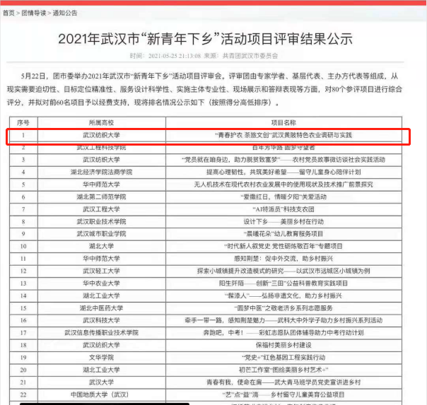5月22日,共青团武汉市委举办了2021年武汉市“新青年下乡”活动项目评审会,由专家学者、基层代表、主办方代表等组成的评审团,从现实需要迫切性、目标定位精准性、服务设计科学性、现场展示和答辩等方面,对80个参评项目进行综合评分。最终,由我校威廉希尔中文官网“青春护农”实践队申报的项目《“青春护农 茶旅文创”武汉黄陂特色农业调研与实践》从80个参评项目中脱颖而出,以第一名的优异成绩成功立项。