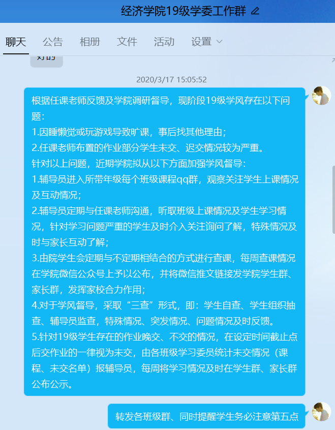 针对调研反馈的学生作业迟交晚交情况,学院将采取每周作业完成情况年级学生群家长群公示制度;针对调研反馈的学生课程迟到未到情况,学院将采取“学生自查+学生组织抽查+辅导员监查+任课老师考查”“四查”形式来进一步加强线上学风督导。