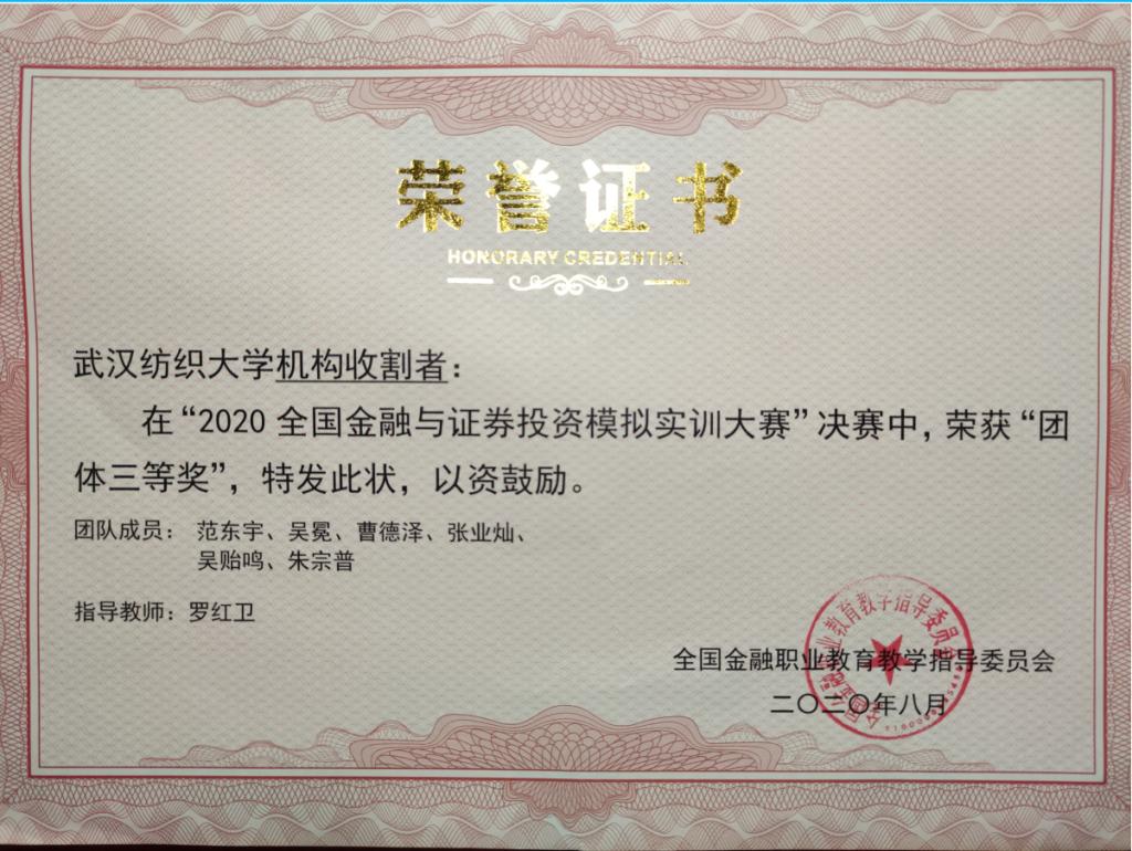 近日,由全国金融职业教育教学指导委员会主办,深圳希施玛数据科技有限公司承办,中国财经数据创新研究院协办的2020全国金融与证券投资模拟实训大赛落下帷幕。威廉希尔中文官网组成的学生团队“纺大队”和“机构收割者队”,在罗红卫老师的指导下,经过激烈角逐,在决赛中荣获团体一等奖、三等奖。