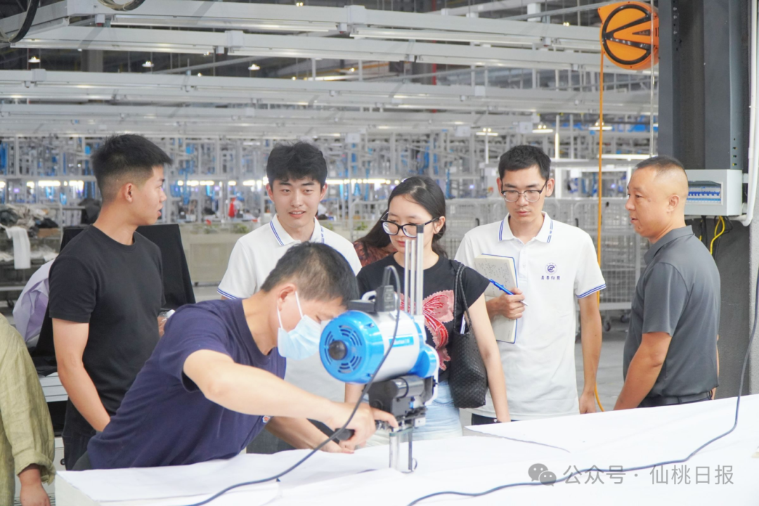 最后,实践团探访了“中国女裤名镇”——毛嘴镇。镇服装产业园管委会主任何知涛向团队介绍基本情况,“目前,毛嘴镇入驻386家企业,有一线产业工人3万余名,年产休闲女裤1.2亿条,时尚女装6000万件,年产值突破百亿元。”团队走访伊炫服饰、中小企业产业园、湖北杰克智联智能科技有限公司。厂区内,工人们指尖翻飞,裁剪、缝纫、锁钉,各道工序精密协作,展现着成熟高效的柔性生产能力。这些企业以其快速响应和精湛工艺,为国内外品牌提供产品。“它们的聚集,正是仙桃纺织服装产业集群效应的生动写照——上下游紧密咬合,大小企业同频共振,共同编织出从“一块布”到“一条裤”的高效、协同产业生态圈。”市经信局副局长李海南表示。