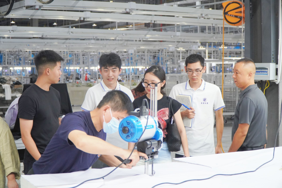 最后,实践团探访了“中国女裤名镇”——毛嘴镇。镇服装产业园管委会主任何知涛向团队介绍基本情况,“目前,毛嘴镇入驻386家企业,有一线产业工人3万余名,年产休闲女裤1.2亿条,时尚女装6000万件,年产值突破百亿元。”团队走访伊炫服饰、中小企业产业园、湖北杰克智联智能科技有限公司。厂区内,工人们指尖翻飞,裁剪、缝纫、锁钉,各道工序精密协作,展现着成熟高效的柔性生产能力。这些企业以其快速响应和精湛工艺,为国内外品牌提供产品。“它们的聚集,正是仙桃纺织服装产业集群效应的生动写照——上下游紧密咬合,大小企业同频共振,共同编织出从‘一块布’到‘一条裤’的高效、协同产业生态圈。”市经信局副局长李海南表示。