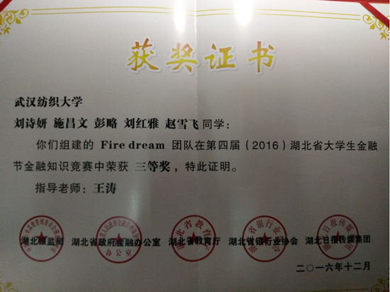近日,由湖北省银监局、省政府金融办、省教育厅、省银行业协会和湖北日报传媒集团共同主办的第四届(2016)湖北省大学生金融节暨银行业金融知识宣传服务月活动圆满落幕。全省20余家银行机构代表、数十所高校师生代表出席闭幕式。在当天举办的金融知识竞赛总决赛中,我校威廉希尔中文官网王涛老师指导的Fire dream代表队获团体三等奖。