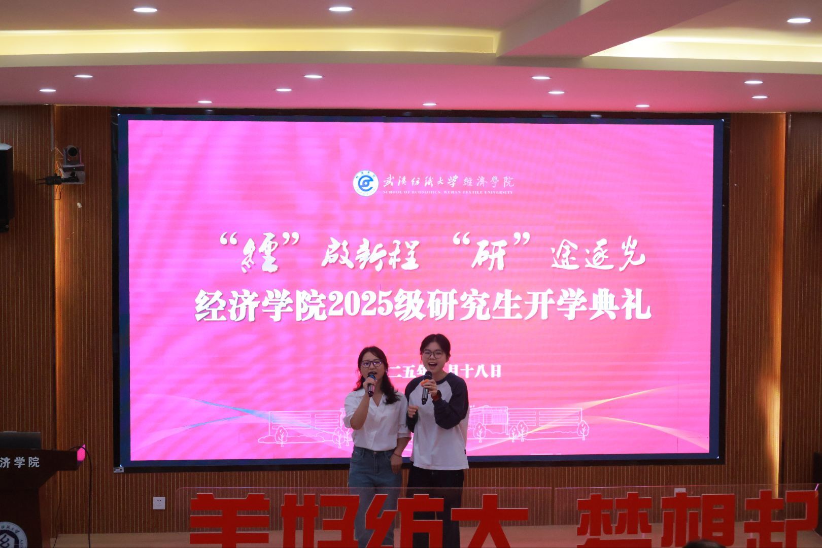 典礼在2025级研究生新生才艺展示中拉开序幕。才艺展示篇章由应用经济学学硕2025级新生范芝怡串场主持,2025级税务专硕新生侯悦深情献唱抒情歌曲《天黑黑》,随后,同专业新生夏雨欣与李鑫携手演绎了歌曲《世界上的另一个我》。高潮迭起的乐曲,激情澎湃的歌声,点燃了师生热情,振奋了师生精神,唱响了新生们“经”启新程、“研”途逐光的心声。