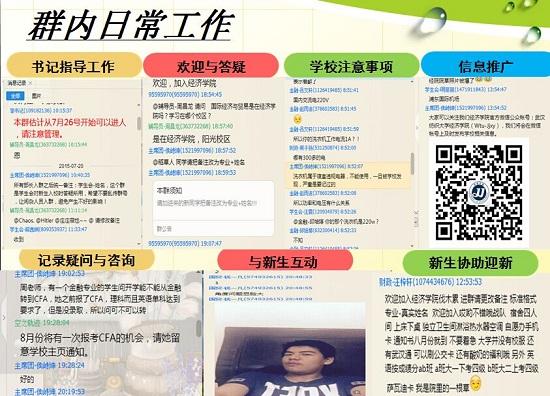 学院领导、骨干教师、辅导员、班主任优秀学生干部早已提前坐镇新生QQ群,除了大力宣传推介学院办学理念、师资力量、专业特色、人才培养成果,还悉心为新生答疑解惑。在新生QQ群内,还先后开展了多种特色活动,专业老师、班主任、优秀学子积极参与到梦想中的“经济”专业大讨论,引导新生正确认识专业,并及早进行学业规划,通过晒自拍照片,新生“提前认识你”,消除隔阂,拉进师生距离,预热同学间的友情,“爱特经院一夏”则通过展示暑期游历的有意义的地方美景,艾特学院官微进行互动,提高对官微的关注度。