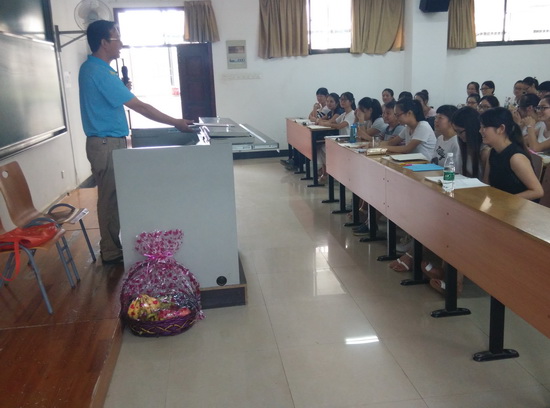 一首高歌结束,经院学子便送上自己精心挑选的礼物和祝福卡。精致小巧的卡片装下寥寥数语,却装不下学生对老师的感谢,每一张卡片是班上同学最真挚感情的表达,说不出口的话语写成文字是如此生动。国贸11302班叶祥龙同学代表全体学生为刘嵩老师送上了美丽的水果篮,礼轻情意重,一份小小的卡片写下最真诚的文字,一个精致的水果篮送出最美好的祝福。
