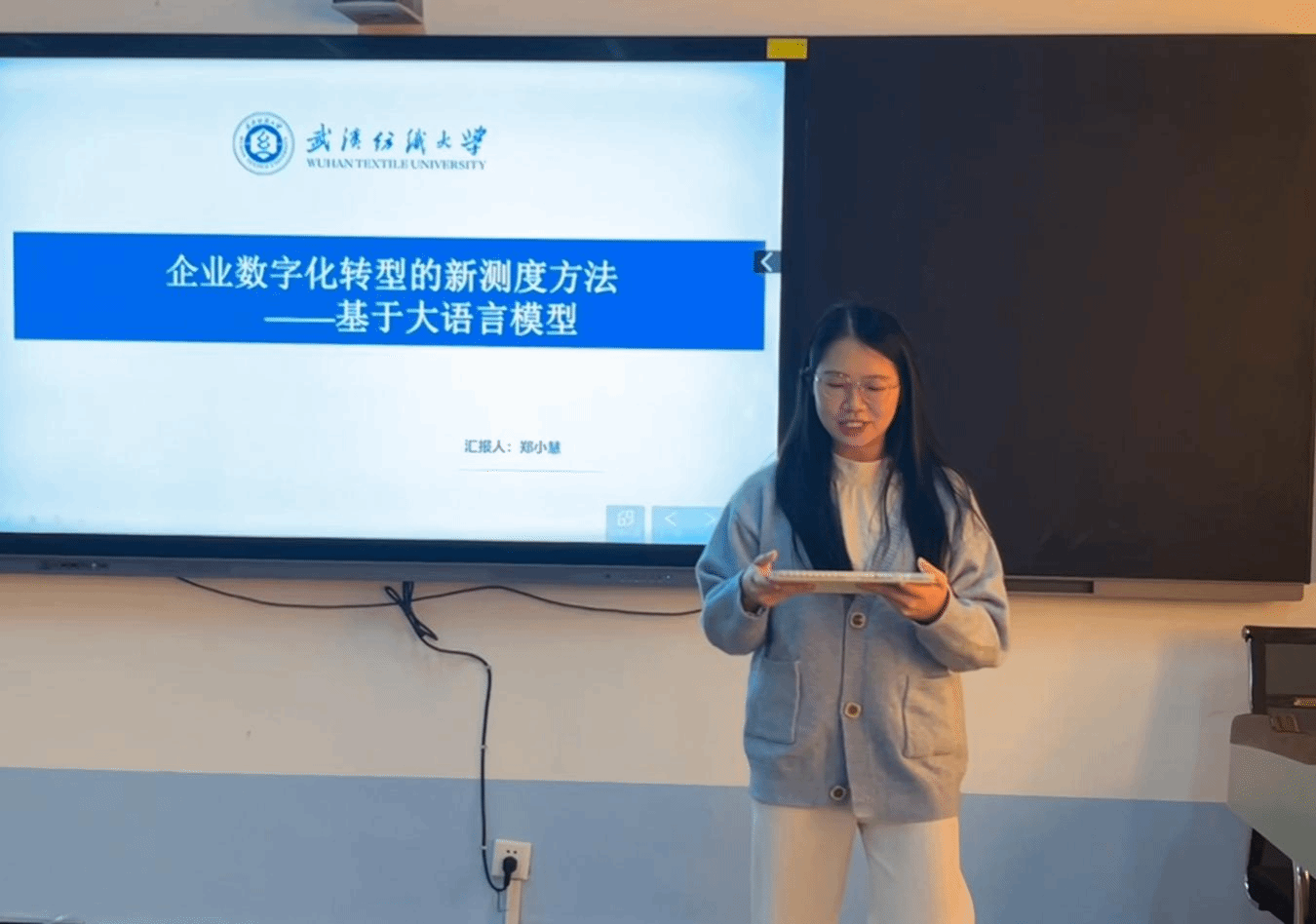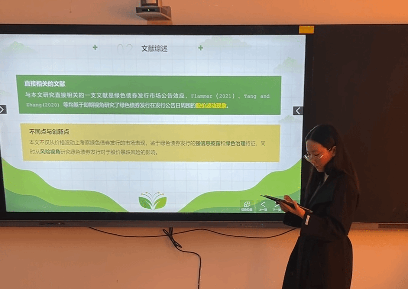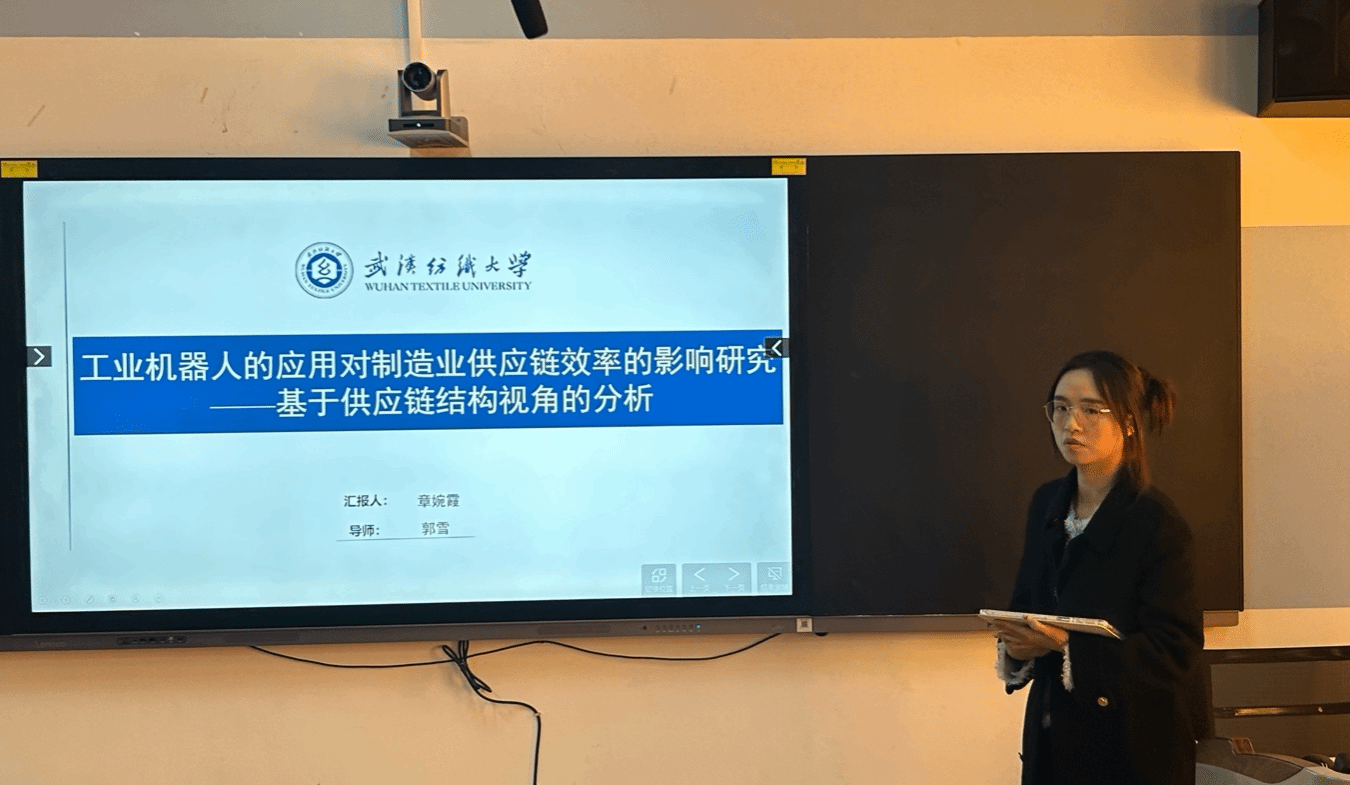 论坛上,四位主讲人分别以ppt的形式向同学们展示了他们最近的学术研究和创新竞赛成果。胡志红同学以“绿色债券发行、企业绿色转型与市场激励效应”为题,详细分析了绿色债券发行对企业绿色治理绩效、融资约束和信息环境的影响机制,揭示了绿色债券如何通过绿色治理、融资约束缓解和信息效应等渠道促进企业的绿色转型和市场表现;章婉霞同学以“工业机器人的应用对制造业供应链效率的影响研究—基于供应链结构视角的分析”为题,探讨了工业机器人通过提升供应链集中度和供需匹配精准度两个渠道改善供应链效率的具体机制,并提出了针对不同类型企业的差异化策略建议;郑小慧同学以“《企业数字化转型的测度难题:基于大语言模型的新方法与新发现》论文分享”为题,通过详细阐述新测度方法的步骤和原理,展示了如何利用自然语言处理技术来科学、准确地测度企业数字化转型程度;吴信婷同学以“商赛解析—从准备到胜利的全程指南”为题,详细介绍了商业精英挑战赛的经验分享,展示了如何在商业竞赛中结合理论与实践,提升创新能力和解决实际问题的能力,增强就业竞争力。