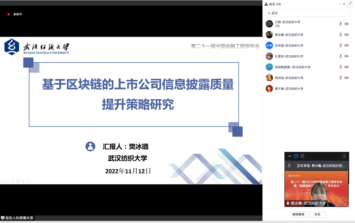 倪武帆教授与研究生文斌、樊冰璐等共同完成的学术论文《基于区块链的上市公司信息披露质量提升策略研究》成功入选,并受邀参加本届年会,樊冰璐代表项目团队在学术论坛上作了主题报告和发言。11月12日下午,樊冰璐在主题为“资本市场与风险投资”的分会场进行了项目研究的成果展示,并就相关研究的背景、方法、技术路线、实证结论等内容作了专题报告。该研究成果以提升企业信息披露质量为目的,揭示了影响信息披露质量的因素,剖析了重要信息虚假披露、负面信息隐瞒披露、无效信息过度披露等诸多信息披露质量问题,提出了运用去中心化技术、分布式账本、智能合约技术、溯源时间戳等对策。樊冰璐的报告精炼、流畅,得到了与会专家的一致好评。同时,樊冰璐还作为点评嘉宾,点评了《金融工程“优质数字金融科技人才”跨专业培养模式的研究》专题报告,在点评分析环节中,结合我校实践,樊冰璐分享了我校威廉希尔中文官网在本科层次有关金融科技方向、CFA方向、金融学双学位的办学经验,在研究生培养过程中充分运用中信证券研究生工作站、长江成长资本股份有限公司研究生工作站、金融数学研究院(筹)等学术平台、实践实训平台提升培养质量的创新做法,得到与会专家学者充分肯定和积极评价。