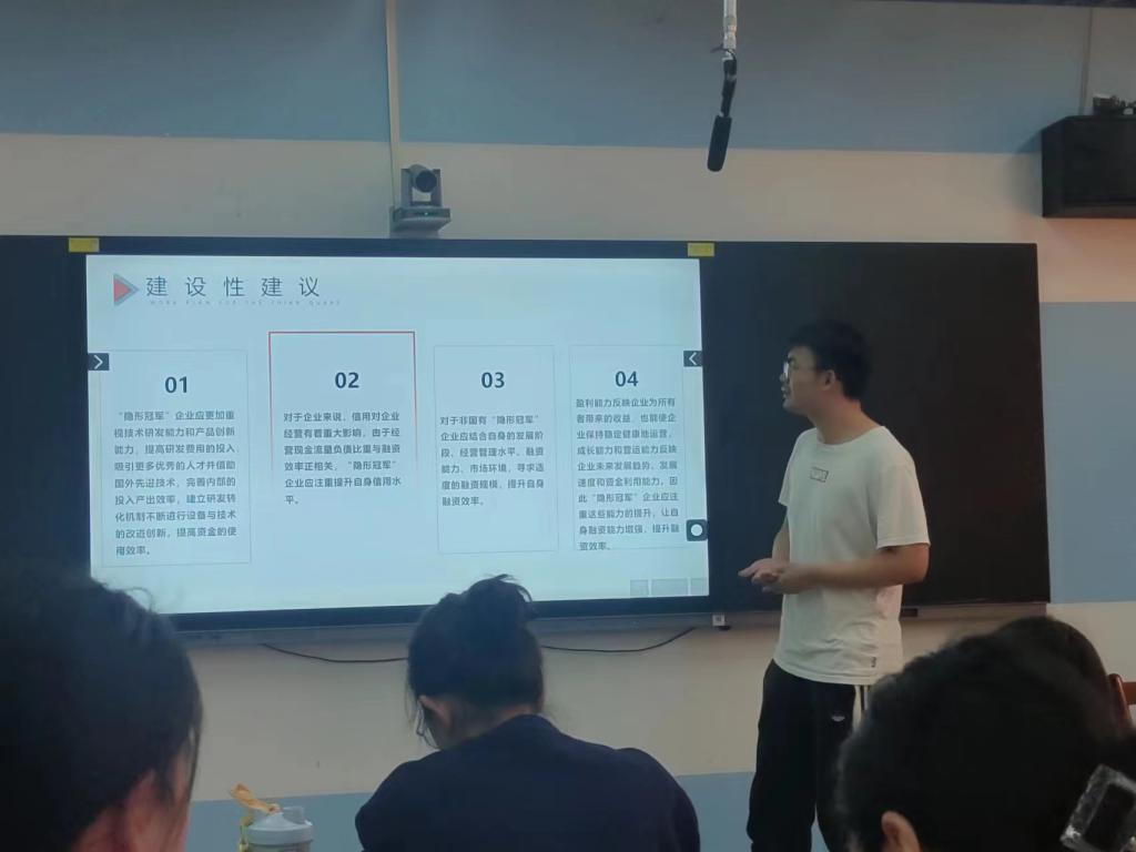 论坛中,杜鑫、闫琳、吴添荣、蔡于婳、谢逸韬5名研究生依次对所撰写的研究内容进行了阐述,就研究思路、研究方法、变量选取和实证分析等展示说明。评审老师针对不足之处提出中肯的、富有建设性的意见和建议。同学们在与老师展开充分交流过程中,认真记下需要重新思考、修改或进一步完善的内容。整个汇报环节,时间安排合理紧凑、气氛张弛有度。