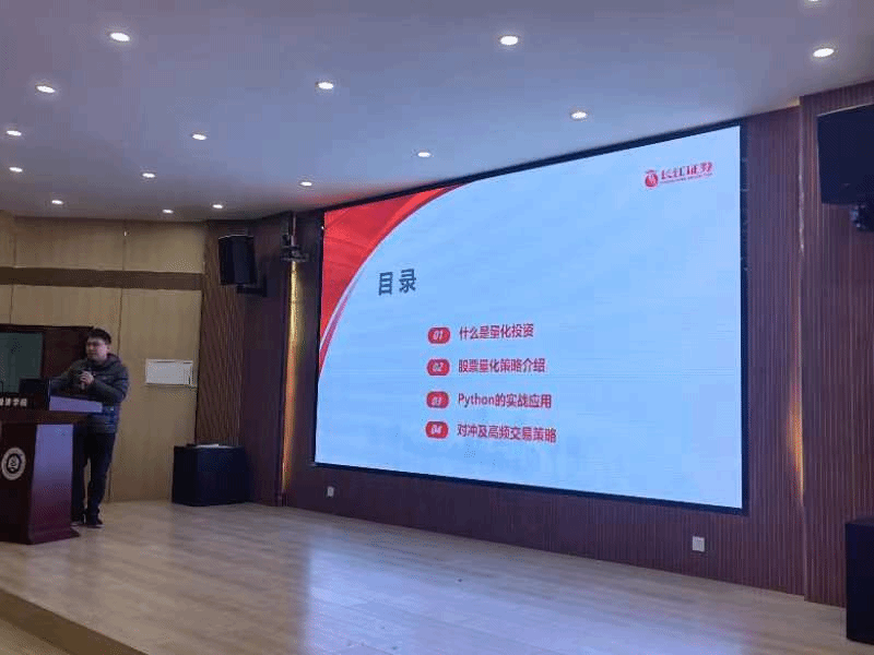 秦昌贵总经理通过讲述股市波动案例引入量化投资的重要性,表明量化投资就是通过数量化方式和计算机技术给出买卖程序,并通过假设验证的以获取稳定收益的交易方式。通过详实的理论分析为同学们奠定一定的量化投资理论基础,接下来对股票量化策略进行详细的讲解,通过时点动量策略、多因子选股等具体案例分析,详细的介绍了量化研究的具体步骤。