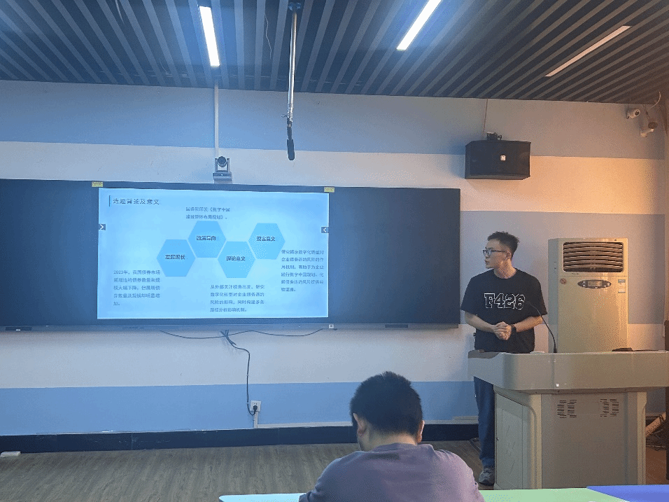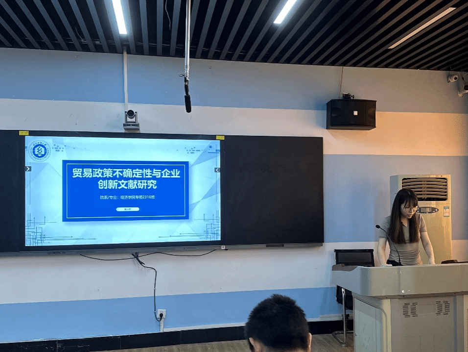 论坛上,五名主讲人分别从研究背景、研究思路以及研究结论等方面分享他们最近的学术研究成果。严格格同学基于当前绿色物流发展的背景,进一步探讨企业ESG评级对物流行业绿色创新的影响研究;吴晓珏同学基于创新创业活力的中介效应,分析数字金融对农民农村共同富裕的影响;张业灿同学从研究背景、理论分析、实证结果等多方面深度分析了一篇文献;丁平同学基于企业外部关注的调节作用,提出数字化转型对企业债务违约风险的影响研究;杨玉格同学通过阅读与整理相关文献,提出贸易政策不确定性与企业创新文献研究。每位同学将自己的研究方法和研究成果从各自不同的角度进行阐述,数据详实,内容完整,循序渐进,深入浅出,充分展现出我院研究生的学术实力和科研水平。