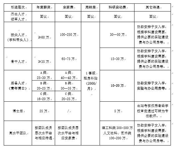 学校将为各类人才提供良好的工作和生活条件,杰出人才、领军人才引进待遇根据实际情况由应聘人员、二级学院及学校共同协商确定,一人一议。其它类人才根据科研工作需要配套科研启动经费和平台建设经费,大力推荐申报国家级、省级人才项目,获批后提供相应条件与待遇(各类人才项目具体申报条件或标准请参照国家、湖北省政策文件),具体如下: