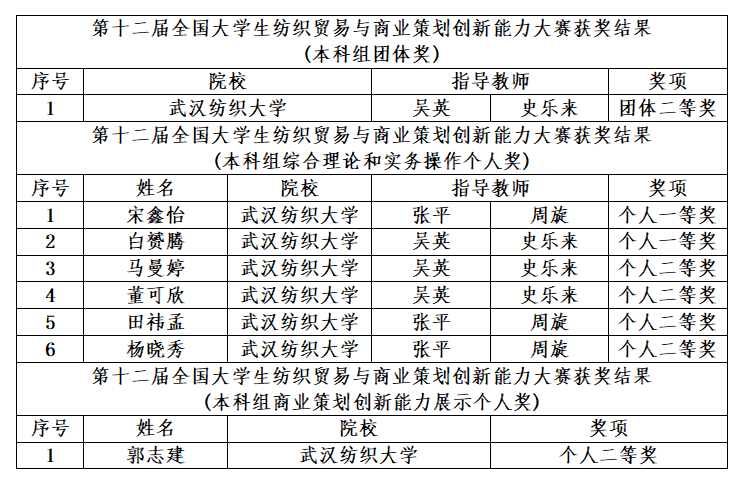 经过激烈角逐,历时两个多月的第十二届全国大学生纺织贸易与商业策划创新能力大赛于11月23日落下帷幕。历经预赛练习、校内预赛、决赛练习、全国总决赛的层层选拔后,代表我校参赛的7名学生在威廉希尔中文官网吴英老师、张平老师、史乐来老师、周旋老师的指导下最终荣获团体二等奖一项,综合理论和实务操作个人一等奖两项、个人二等奖四项,商业策划创新能力展示个人二等奖一项,再创佳绩。