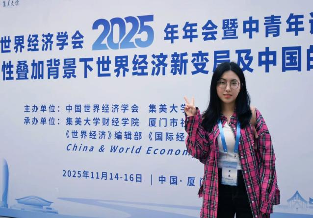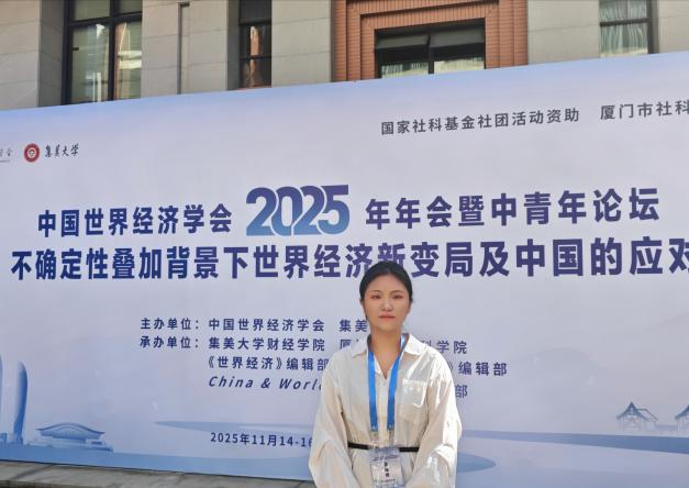2025年11月14-16日,由中国世界经济学会,集美大学主办,集美大学财经学院,厦门市社会科学院,《世界级经济》编辑部,《国际经济评论》编辑部,China & World Economy 编辑部承办的中国世界经济学会2025年年会暨中青年论坛一不确定性叠加背景下世界级经济新变局及中国的应对在福建·厦门·集美大学举行。本次会议旨在共同探讨世界级经济理论与实际问题,谋划发展我国的世界经济研究工作。我校威廉希尔中文官网吴媛媛和夏鑫两位研究生参加本次大会,受邀做题为“基于美印光伏产业链合作的中美竞合策略研究——动态演化博弈模型”的汇报。