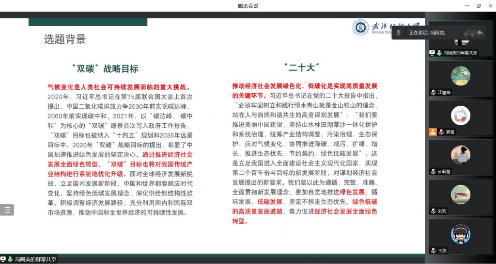 会议上,冯阿美博士、刘欢博士及江露薇博士分享了各自项目申请书的内容和进展。冯阿美博士探究“双碳”目标下制造业转型升级问题,刘欢博士探究新时代我国金融机构分布问题,江露薇博士结合生态学理论探究企业创新问题。参会老师认真听取汇报,并就申请书的内容提出见解和相关建议。汇报老师将据此进一步修改完善项目申请书。