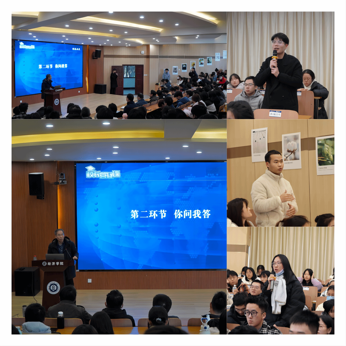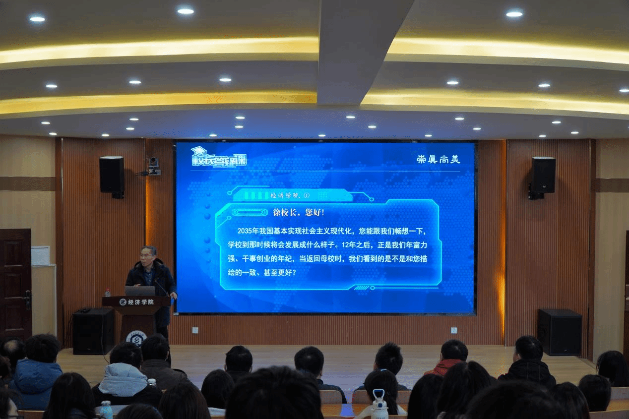 “2035年的母校会是什么模样?”“经贸专业该如何在新时代突围,寻求更好的发展?”“您如何看待‘板凳甘坐十年冷’‘网红一夜暴富’的现象?”……
