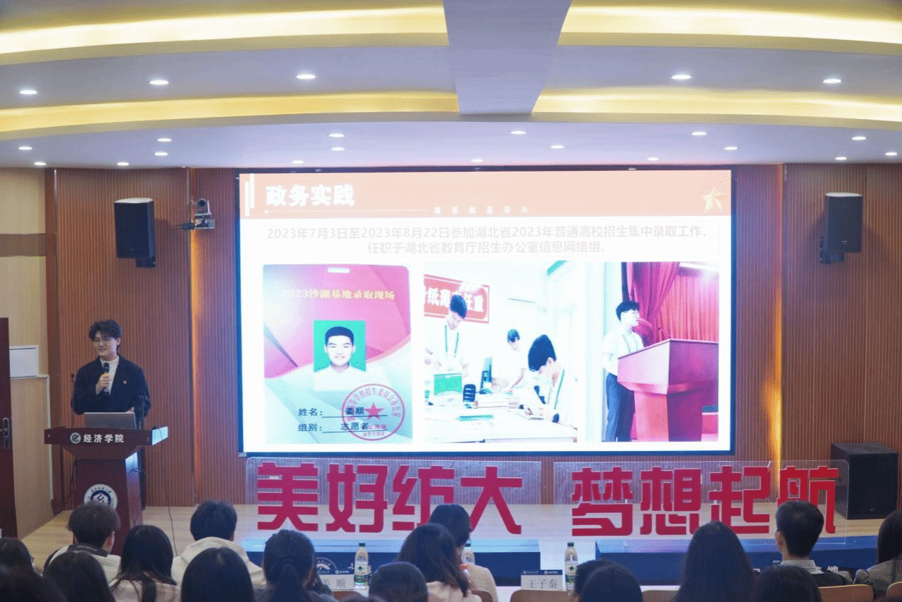 姜顺以“从‘办公室’走向‘泥土地’”为主题,分享了自己任职于湖北省教育厅招生办公室信息网络组政务实践的经历和收获,即要有忍耐力、直觉力与行动力。“村民大会上来了个大学生”,姜顺深入湖北随州凤凰山村开展实践调研,积极参与讲好湖北基层治理的故事,聚焦议事协商如何赋能乡村治理现代化。同时,他分享了团队在社会实践方面的宝贵经验,从前期的理论学习、团队研讨、资料准备、宣传预热到发动动员,详细的讲述了每一步的关键点和需要研讨的问题,总结出“六个勤”,即勤动手、勤动口、勤动脚、勤总结、勤关心。他寄语大家在“第一课堂”学好专业知识,走出校门在“第二课堂”了解群众生活、见识社会百态,形成正确的社会观察,全面提升社会化能力,让人生出彩舞台越来越宽广。
