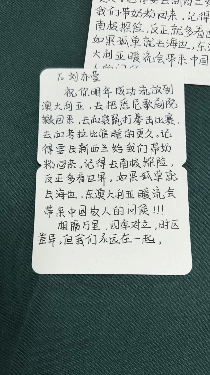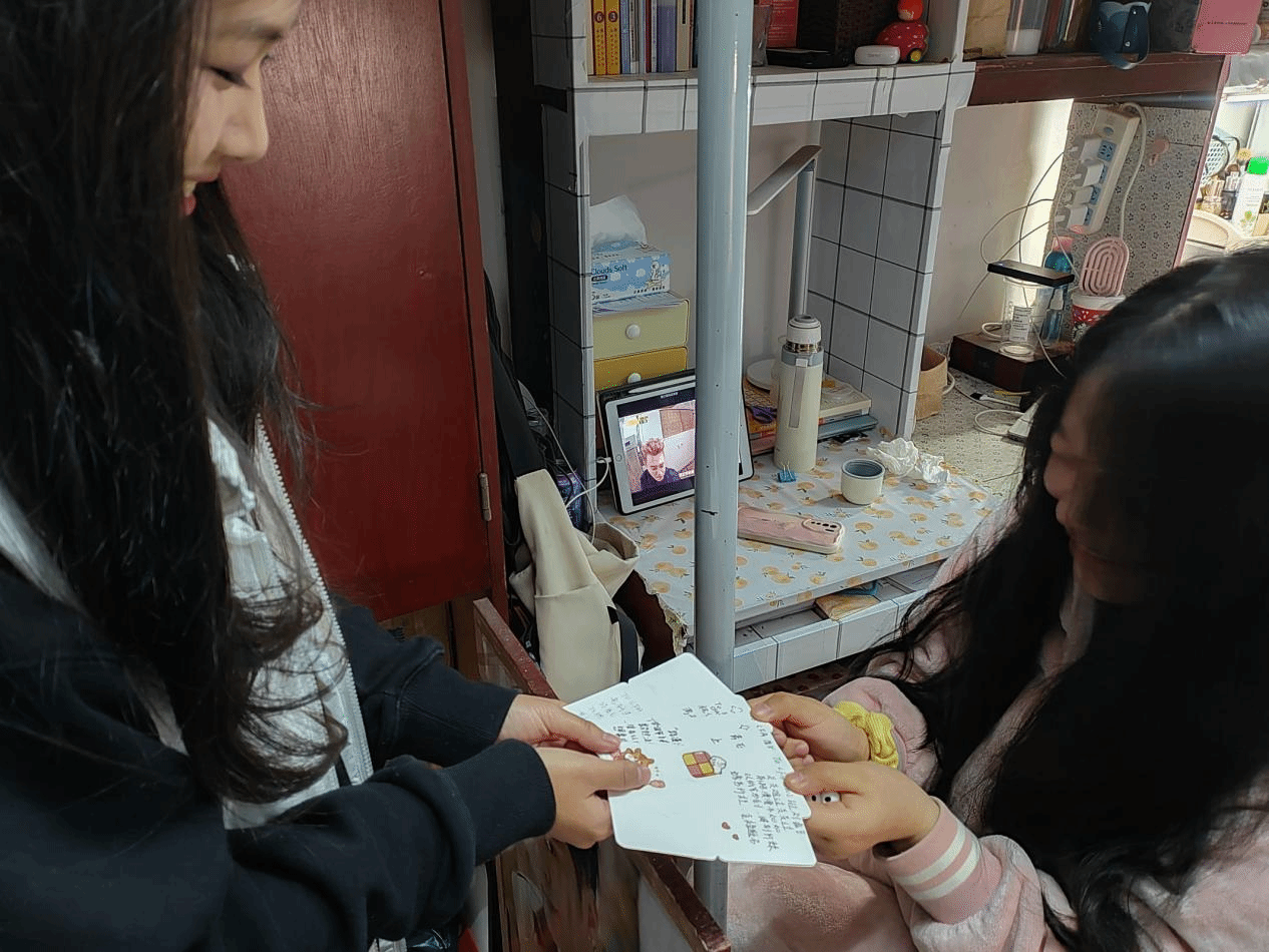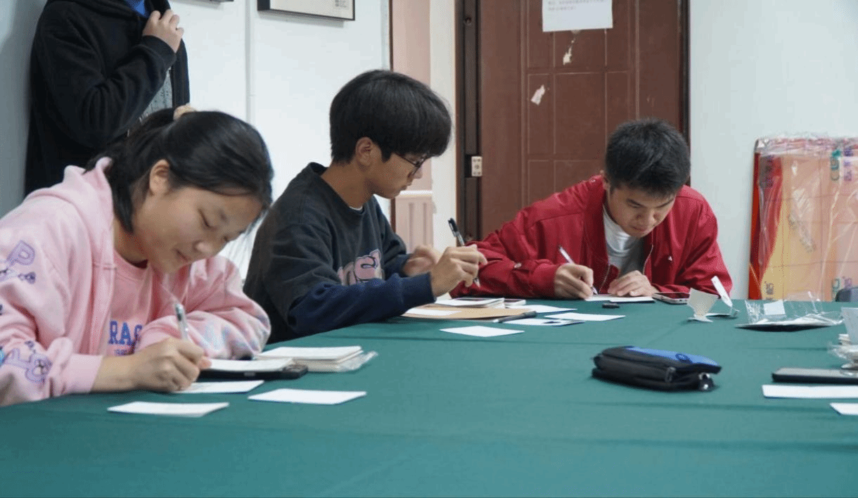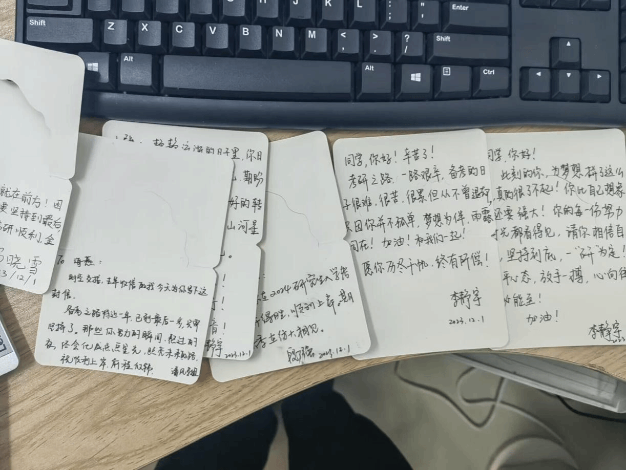 大一新生们以极大的热情投入到活动中,他们一字一句斟酌,希望将自己的祝福以最完美的方式表达出来。每一张卡片都充满了对学长学姐们的鼓励和祝福,如 “你一定能成功上岸,我们为你加油!”和“愿你笔下生花,金榜题名!”等等。写好的卡片由学院成长服务部部长细心地分拣归类,再由各位干事亲手送到每一位考研学子的手中,以确保每一份祝福都能准确无误地传达。