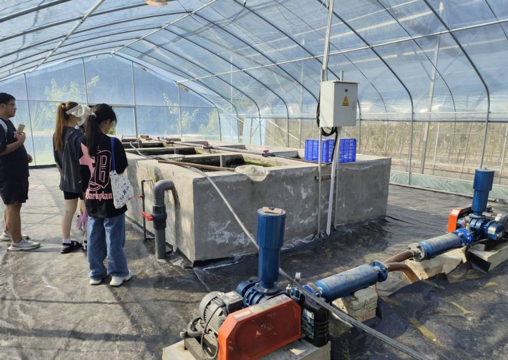 实践团队共走访了五个鱼菜共生新产业实践点,了解鱼菜共生系统的运作模式。当地技术负责人详细介绍到,“通过将传统水产养殖和无土栽培技术‘无缝衔接’,实现养鱼不换水,种菜不用土、不施肥、不打农药,是一种环保、安全、健康的生态循环农业模式。”