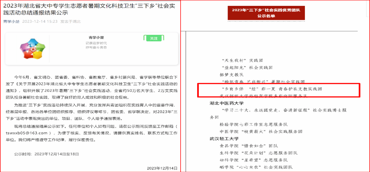 在学生全员参与、教师全过程指导下,学院获批共青团中央2023年“新疆学子百村行”专项活动、中国青年志愿者2023年“圆梦工程”农村未成年人优秀传统文化传承志愿服务项目、湖北省青年志愿者2023年湖北省“七彩假期”志愿服务项目等省部级立项3个。获批第三届产业经济国际论坛一等奖、二等奖各一项,公开发表论文1篇。团队社会实践事迹被中国青年网、中新网、湖北高校思政网、江夏融媒等权威媒体报道26篇。