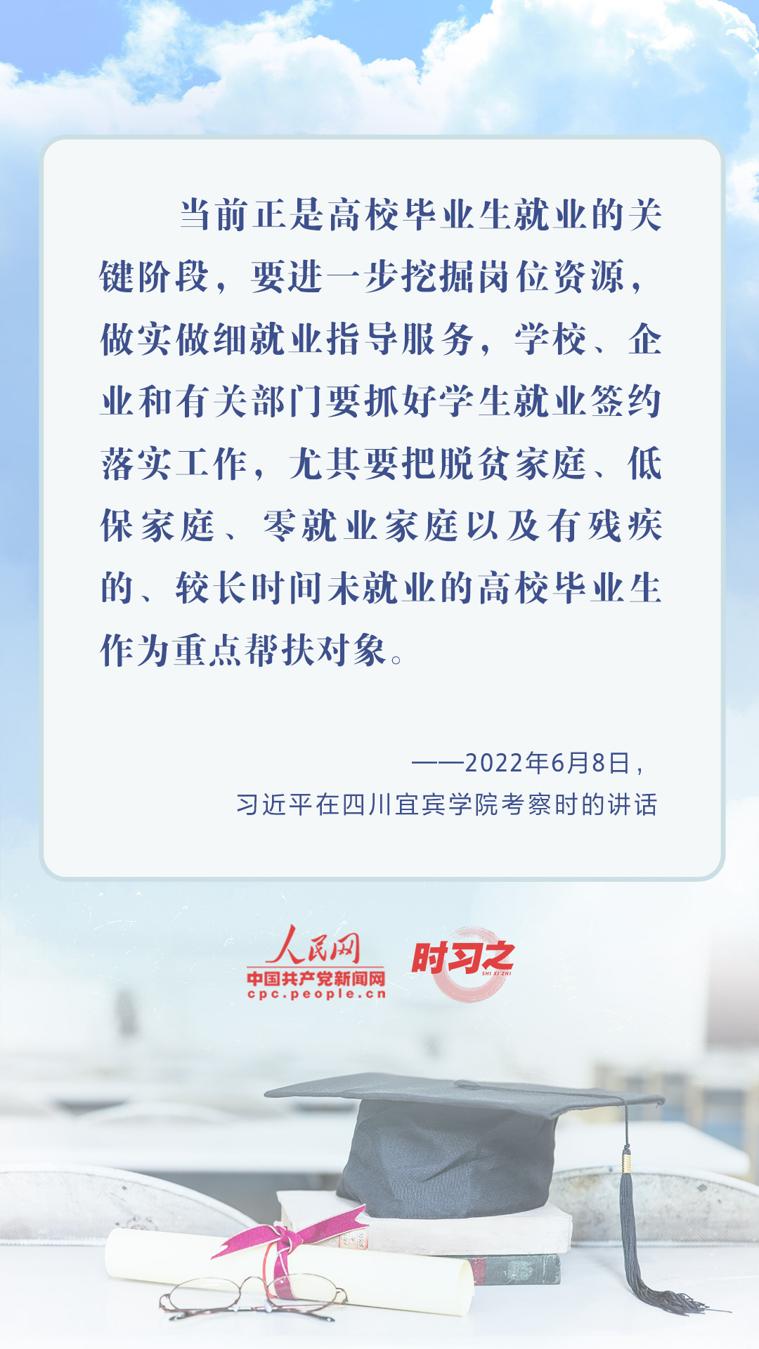 2022年6月8日上午,习近平总书记再入四川考察,来到宜宾学院考察调研,察看毕业生创新创业代表作品展示,了解学校开展就业创业指导服务工作。习近平总书记十分关心高校毕业生就业情况,解决好高校毕业生这一重点群体的就业问题,支持帮助学生们迈好走向社会的第一步,他始终挂念心间。
