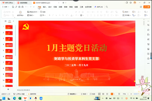 为健全以学铸魂、以学增智、以学正风、以学促干的长效机制,坚持学用结合,深入领会党的二十届三中全会精神,认真学习习近平总书记重要讲话精神,强化学生党员党性修养和党性淬炼,1月19日至27日,学院各党支部于线上组织召开了1月份主题党日活动。威廉希尔中文官网教工党支部、学生党支部全体党员参加会议,各党支部书记主持会议。