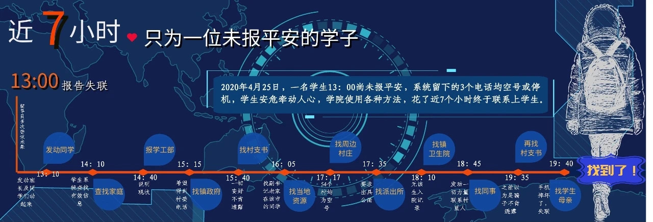 学生安危牵动人心。我立即要求辅导员通过班长发动全班同学,并从学工系统和录取表中查找有效信息,未果;我又联系上学生的高中同校、目前同院同学,也一无所获,时间来到14:10。